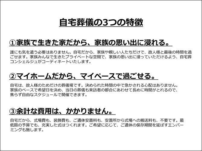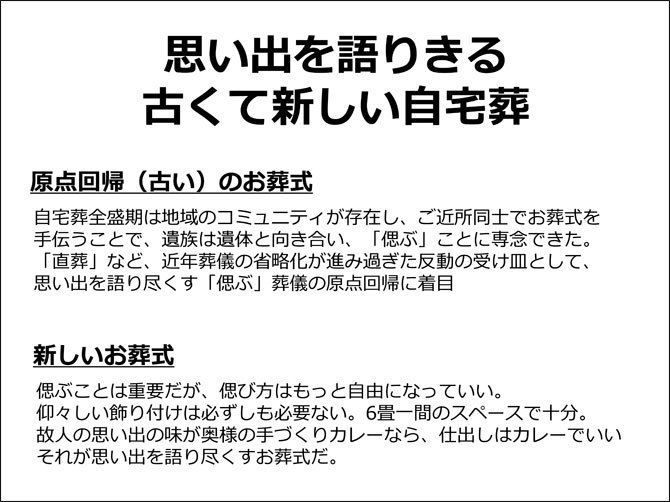 鎌倉自宅葬儀社では、3~7日間かけて自宅でゆっくりと個人をしのぶ葬儀を提案。1日目は何もしないことを推奨している(企画書より)