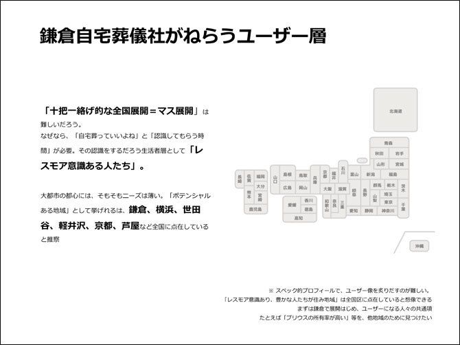鎌倉自宅葬儀社では、3~7日間かけて自宅でゆっくりと個人をしのぶ葬儀を提案。1日目は何もしないことを推奨している(企画書より)