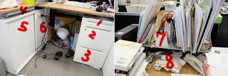 片づけ前に、写真を見て客観視。収納スペースに番号を振り、どこに何を入れるか決めておく。編集Aの場合、6のスペースがすべて前任者が置いていったゲラと写真で埋まっていた。机の上の棚、7と8が一番いい場所だ。
