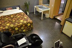 ダブルベッドやマッサージチェアなど通常のビジネスホテルにはない「ぜいたく品」(関係者)を備えた寝室。トイレと風呂は別々で、サウナもある=福岡市博多区の「ホテルエリス」