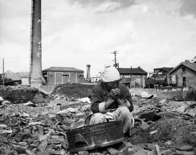 荒廃したソウル市内で、がれきの中に座りこむ年配の女性(1950年11月1日、写真=ROGER_VIOLLET)