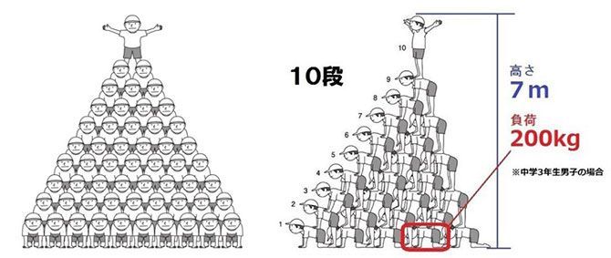 立体型の10段ピラミッド:正面図(左)および側面図(右)(※拙著『教育という病』(光文社、2015)に掲載した図に筆者が加筆)