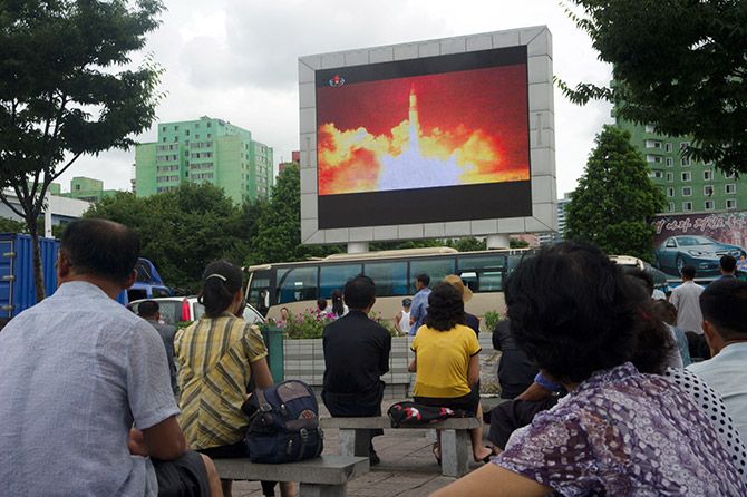 北朝鮮の大陸間弾道ミサイル(ICBM)「火星14」が発射される模様を眺める平壌の市民。(写真=AFP=時事)