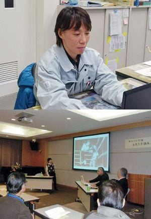 (上)普段は岡山市役所の福祉関係の部署に勤務。訪れる人の悩みや話に耳を傾けることを心がけているという(写真=池山さん提供)(下)2014 年12 月、せとうち村塾市民大学講座に招かれ「世界チャンピオン~池山直の世界」として講演(写真=池山さん提供)