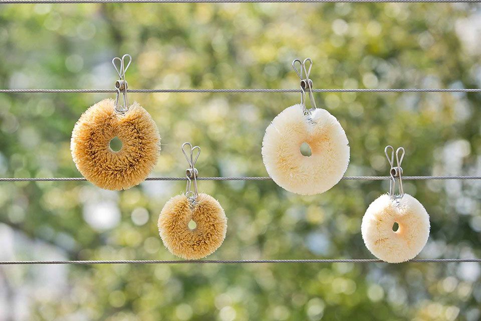 ヤシの実繊維を脱色した「ホワイトパーム」と、柔らかいサイザル麻繊維を使用した「サイザル麻」。ベーグルのような円形で乾きやすい。