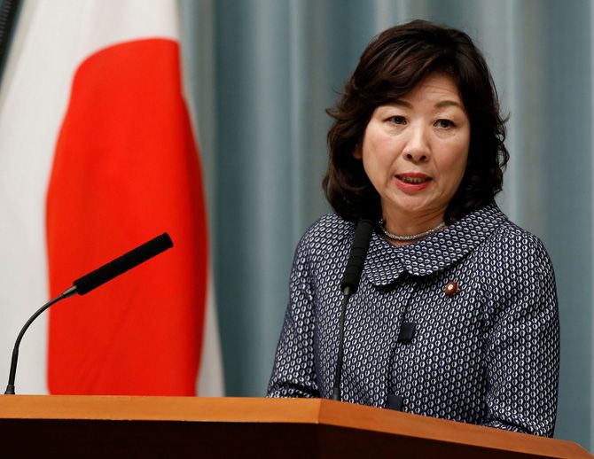 第3次安倍第3次改造内閣が発足し、記者会見する野田聖子総務相=8月3日夜、首相官邸(写真=ロイター/アフロ)