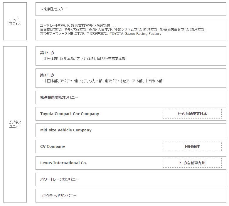 トヨタは2016年からカンパニー制をひき、各カンパニーにプレジデントを置いている(2016年4月当時のもの)。