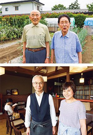 (上)「毎日の仕事は野菜畑の手入れと風呂掃除。気ままに生きているのが長寿の秘訣」と話す山田内明さんと妻の君枝さん。(下)池原和雄さんの趣味が高じ、店のスピーカーは約600万円のJBL、音源はすべてレコード。隣は妻の以代子さん。
