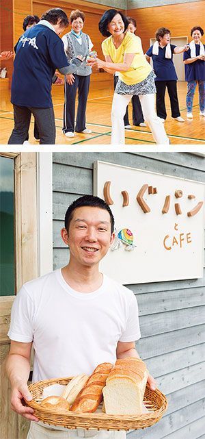 (上)「健康体操」を指導する水口あい子さんは、他にヨガ教室などでも教える。18年前に夫の政夫さんと神奈川県から移住。(下)7年前に夫婦で移住した井口正治さん。村で人気の「いぐパン」を経営。パンを選びカフェで食べることもできる。