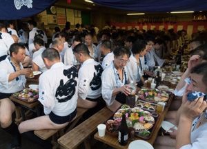 直会の席。若手が礼儀作法を身に付ける場でもある(撮影・比田勝大直)