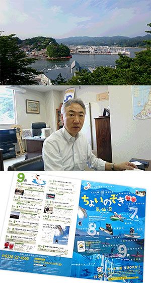 (上から)リアス式海岸が美しい気仙沼の街なみ/気仙沼商工会議所の菅原昭彦会頭(老舗蔵元・男山本店社長)/「ちょいのぞき気仙沼」パンフレット