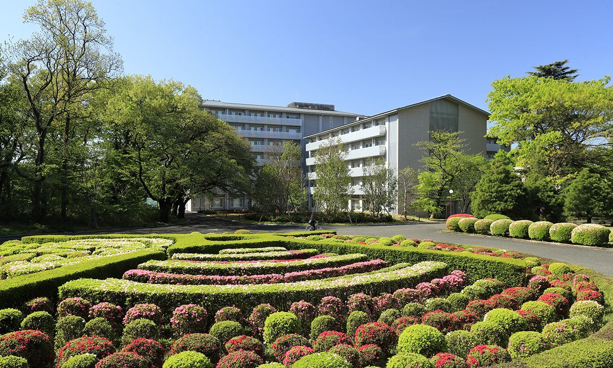 大学本館前に広がる芝生広場。昼休みには芝生に座って昼食を食べる学生の姿が見られる。