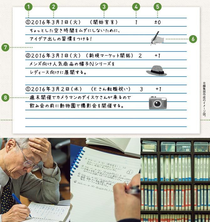 (上)(1)本日の発想ナンバー(2)日付(3)発想カテゴリ(4)アイデア番号(5)ノルマ達成カウンター(6)イラスト(7)1行のアキ(8)どんなアイデアでも書く(左下)1日1個から始めよう!(中央下)A5ルーズリーフがおすすめ(右下)ある程度書きためたらファイルに整理