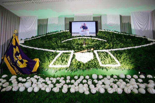野球のグラウンドに見立てた祭壇に、献花ではなく献球を行った(写真提供:鎌倉新書)