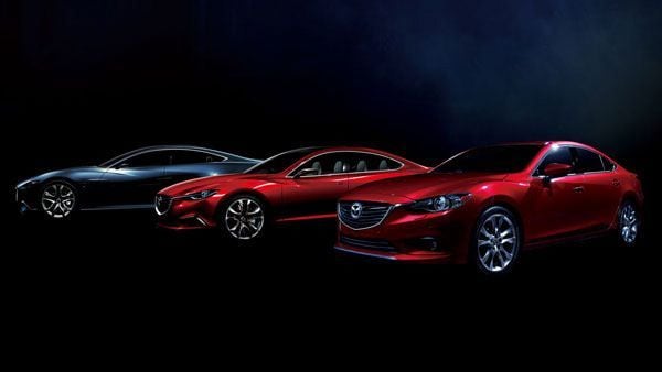 左からマツダのコンセプトカー靭(SHINARI、2010年発表)、雄(TAKERI、2011年発表)、右が3代目アテンザ。