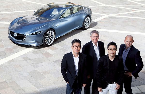 コンセプトカー「靭」と、2010年のマツダデザインチーム。左から前田育男氏、ピーター・バートウィスル氏、中牟田泰氏、デレック・ジェンキンス氏。