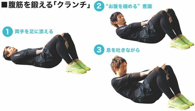 手を足に添えて息を吐きながらゆっくり上がる。反動で上がらずに、お腹を縮めるのを意識して、お腹の力だけで、ゆっくり。あまり起き上がる必要はない。