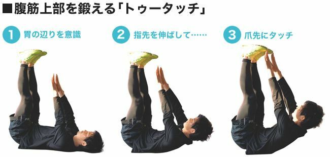 お腹を上にして胃の辺りを意識しつつ、その部分に力を入れながら、両手の指先を垂直に上げた足の爪先にタッチする。