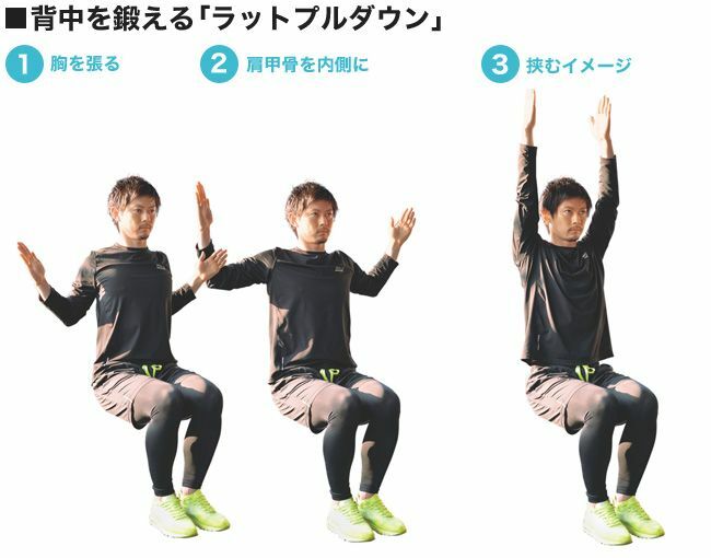しっかり手を伸ばしたら、肘を後に引きながら、肩甲骨を内側に寄せていくのを意識して、挟むようなイメージで中に寄せていく。胸は必ず張った状態にする。