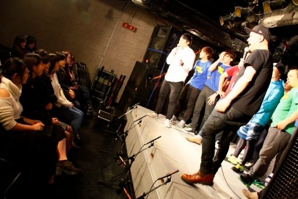 (上)公開オーディションで最優秀賞に選ばれた「晩白柚」の2人。吉本興業福岡支社の野中雅弘支社長から直接スカウトされ、福岡吉本入りが決まった(中)公開オーディションに駆け付けた「ロバート」の馬場裕之(正面左)や「シソンヌ」の2人(右隣)。軽妙なトークで本番直前の会場を盛り上げた(下)交通事情のため、公開オーディション会場に遅れて到着した「ロバート」の秋山竜次。得意の体ものまねでベテラン俳優・梅宮辰夫になりきり、爆笑を誘った