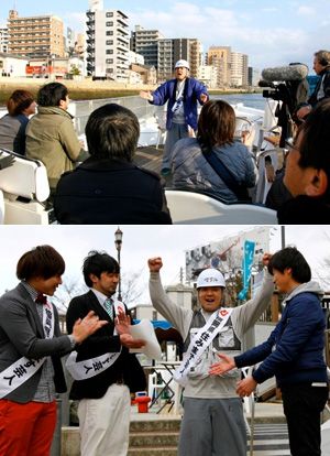 (上)那珂川を周遊する水上観光バスに「一日お笑い船長」として乗船し、報道陣を前にネタを披露する福岡吉本のピン芸人、マサル(中央正面)(下)先輩コンビ「ぶんぶん丸」(左の2人)に続いて「福岡県済みます芸人」に就任したピン芸人・マサル(右隣)