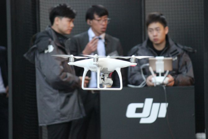 都内でデモ飛行する世界最大のドローンメーカー・DJIのドローン。典型的なマルチコプターだ