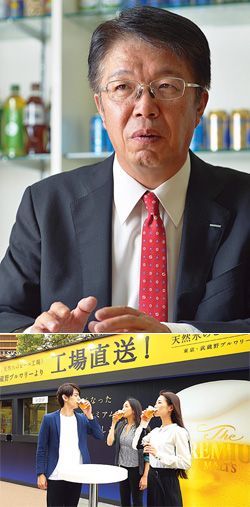 (上)サントリービール 山田賢治社長(下)東京・六本木で行われた「ザ・プレミアム・モルツ フェスティバル」の様子
