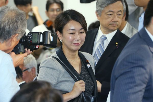 民進党両院議員総会を終え、退出する山尾志桜里元政調会長(中央)=9月5日、東京・永田町の同党本部(写真=時事通信フォト)