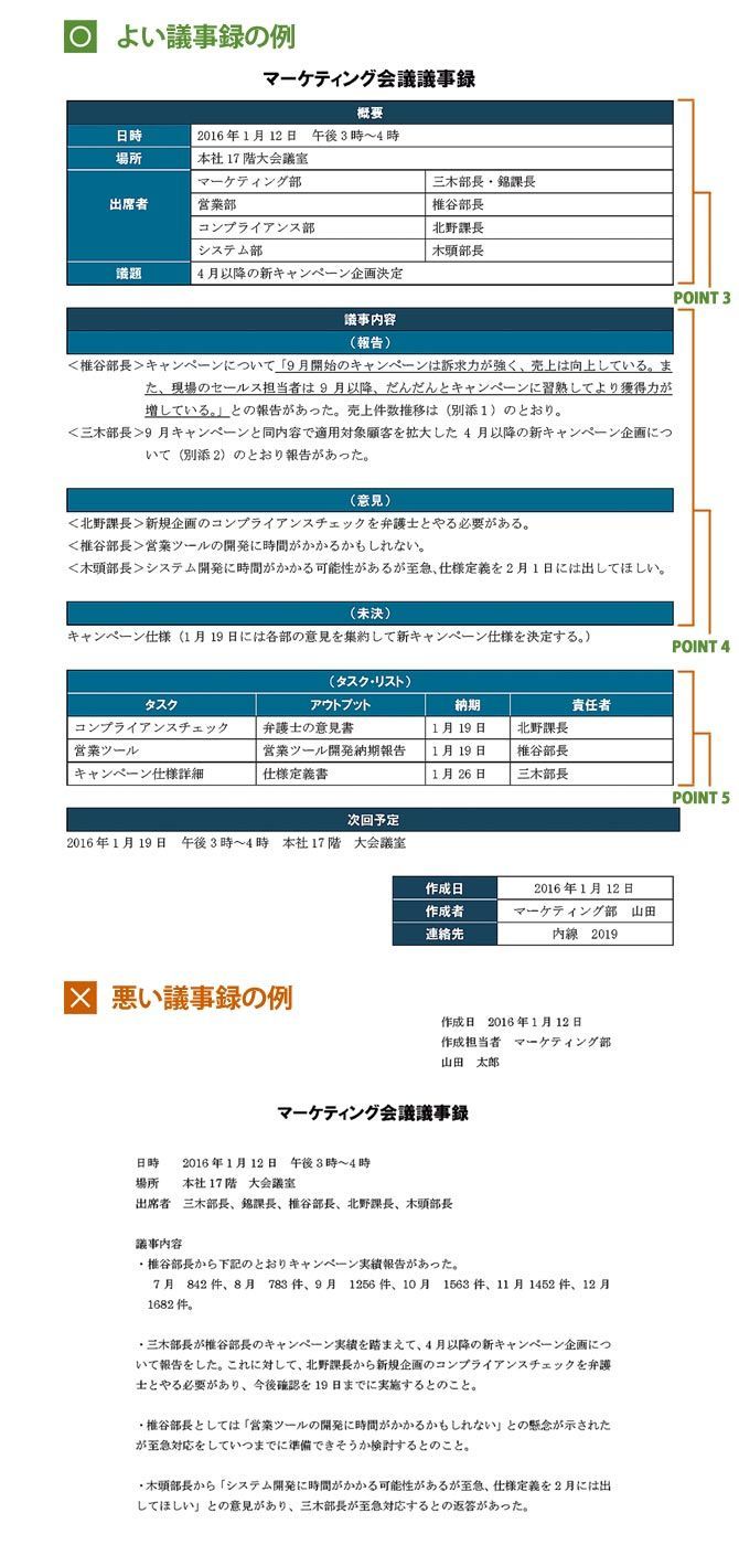 (上)よい議事録の例[POINT 1] A4サイズでフォーマット化[POINT 2] ゴシック体と明朝体を使い分け[POINT 3] 会議の概要は事前に記入[POINT 4] 報告、意見、決定・未決の区分を明確に[POINT 5] 肝心要のタスクリスト (下)悪い議事録の例