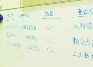タスクリストはホワイトボードに書き出し、全員の確認をとりながら決定する。