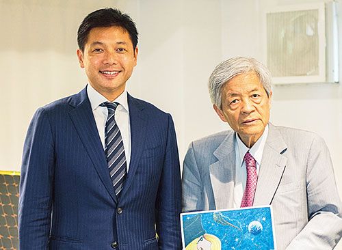アストロスケールの岡田光信CEO(左)と田原総一朗氏。