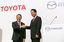 8月4日、資本・業務提携の共同記者会見の最後に握手するトヨタ自動車の豊田章男社長(左)とマツダの小飼雅道社長。(写真=AFLO)