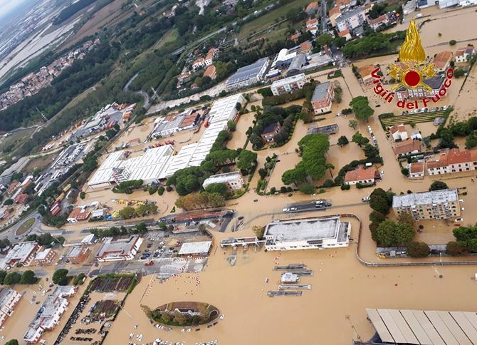 9月10日、イタリア各地で豪雨による洪水が発生し、西部トスカーナ州リボルノでは民家が浸水して家族4人が死亡するなど計6人が犠牲になった。写真は同州リボルノの空撮写真=伊消防当局提供(写真=AFLO)