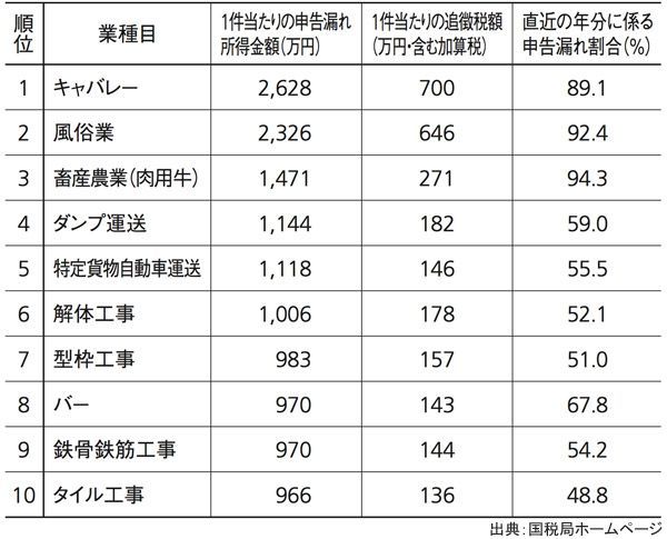 平成27年度・事業所得を有する者の1件当たりの申告漏れ所得金額が高額な上位10業種