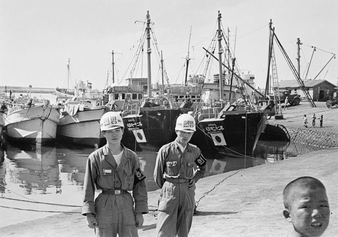 韓国当局に拿捕されて釜山港に連行された日本漁船と、その警備にあたる憲兵(1955年12月/写真=時事通信フォト)