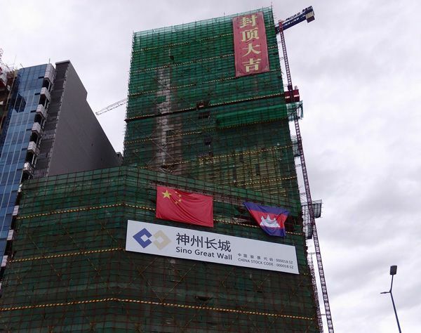 プノンペン市内の一等地に中国企業が建設中のビル。堂々と掲げられた中国国旗とよじれたカンボジア国旗が、両国の力関係を象徴しているようだ。