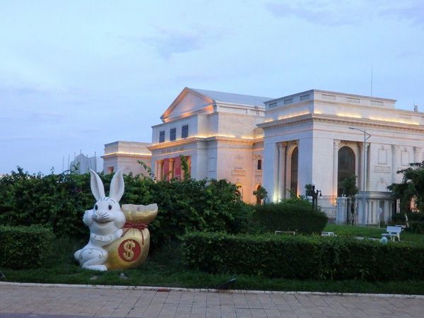 中国が建設したシティホールと、謎のウサギのオブジェ。プノンペン市内Koh pich地区で。
