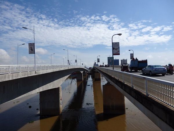 従来あった日本・カンボジア友好橋(右)と並行して、中国は近年になり中国・カンボジア友好橋(左)を建設。渋滞が多いトンレサップ川の橋が事実上の4車線化したことで、地元の評判は上々だ。