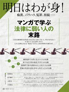 雑誌『PRESIDENT』(2017.10.16号)。法律特集の目玉企画は「マンがで学ぶ法律に弱い人の末路」。本記事で紹介した子供連れ去りに加え、痴漢、パワハラ、冤罪、相続などについて解説している。