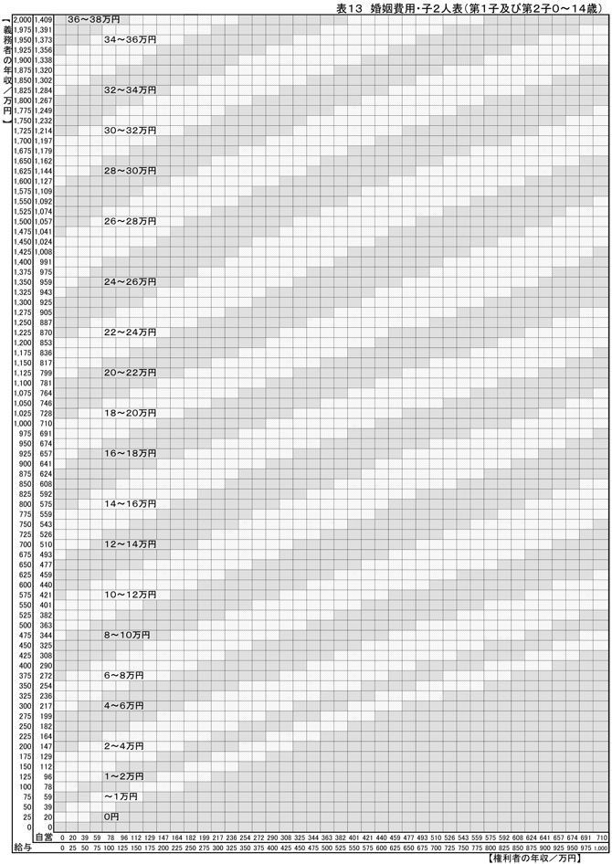 東京家庭裁判所ウェブページの「養育費・婚姻費用算定表」より 婚姻費用・子2人表(第1子及び第2子0~14歳)