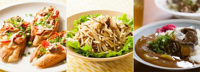 左から、「まぐろの尾肉のバゲットピザ」「小女子と大根のサラダ」「いわしの醤油缶詰カレー」。いずれも木の屋のウェブサイト内でレシピを見ることができる。(写真提供/木の屋石巻水産)