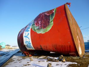 道路の中央分離帯に横たわる鯨缶タンク(当時) /2012年2月筆者撮影