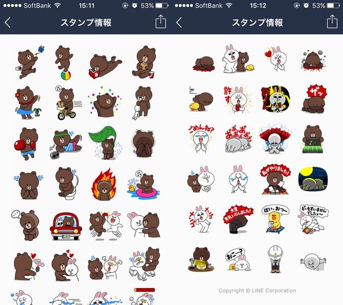 LINE公式の人気キャラクター、ブラウン&コニーも初期は無言(画像左)。新しいスタンプではよくしゃべるように。