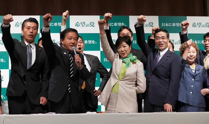 9月27日、結党記者会見で気勢を上げる新党「希望の党」代表の小池百合子都知事(前列中央)、若狭勝衆院議員(同右から2人目)、細野豪志元環境相(同左端)ら(写真=AFLO)