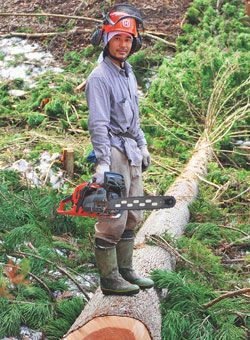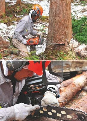 倒す方向を見極めながらチェーンソーで伐採作業を続ける藤田さん(写真上)。チェーンソーを入れる場所を間違えると自分のほうに木が倒れるため、細心の注意を払う。70個以上あるチェーンソーの刃を研ぐ「目立て」は、伐採の作業効率を左右する大切な仕事だ(写真下)。