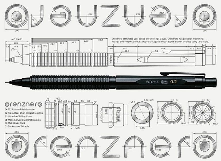 オレンズネロには、製図用シャープペンシルに多い、12角のデザインが継承されている。