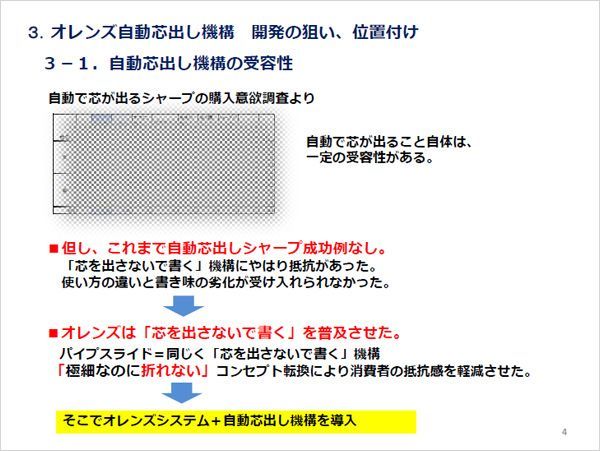 2014年発売の先行商品「オレンズ」では、軸に「芯を出さないで書いてください」と大きく注意書きを貼っていた。