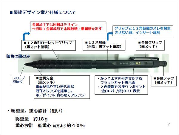 オレンズネロには、製図用シャープペンシルに多い、12角のデザインが継承されている。