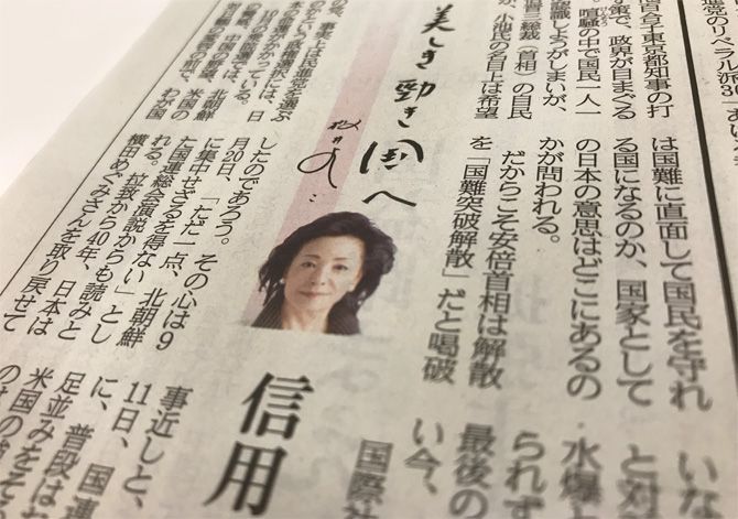 産経新聞(10月2日付)、1面と2面に掲載された櫻井よしこ氏のコラム「美しき勁(つよ)き国へ」。