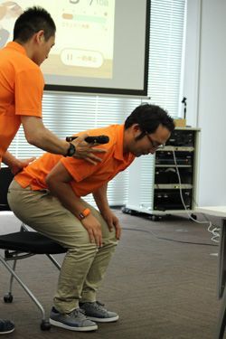 ベンチャーのMoffが開発した「モフトレ」。タブレットとウェアラブルのバンドを用いてリハビリ(個別機能訓練)を支援する。写真は都内で行われた製品発表会のデモ風景。手首にバンドが見える。